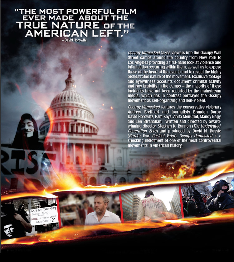 Occupy Unmasked features the conservative visionary Andrew Breitbart and journalists Brandon Darby, David Horowitz, Pam Keys, Anita MonCrief, Mandy Nagy, and Lee Stranahan. Written and directed by award-winning director, Stephen K. Bannon (The Undefeated, Generation Zero) and produced by David N. Bossie (Border War, Perfect Valor), Occupy Unmasked is a shocking indictment of one of the most controversial movements in American history.