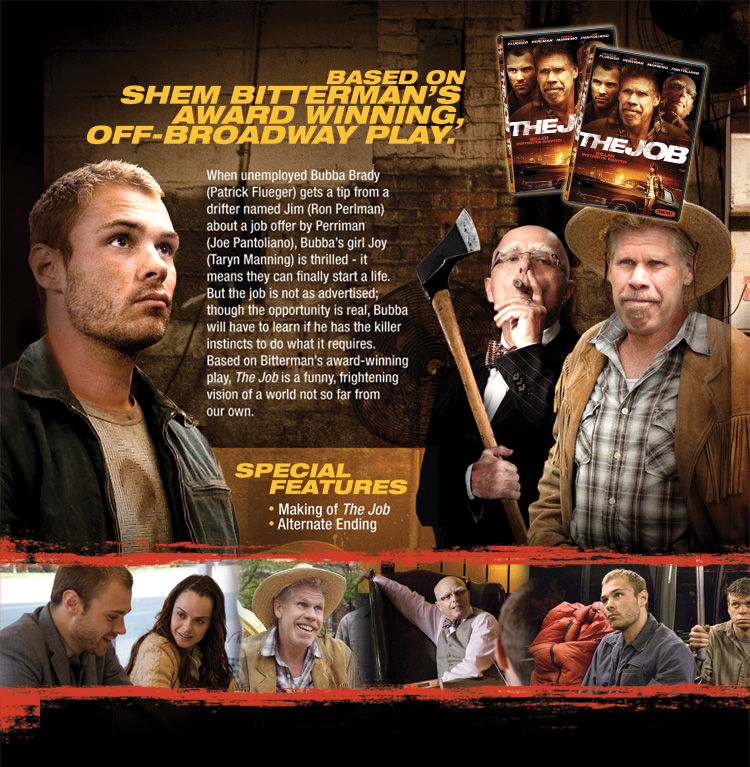 When unemployed Bubba Brady (Patrick Flueger) gets a tip from a drifter named Jim (Ron Perlman) about a job offer by Perriman (Joe Pantoliano), Bubba’s girl Joy (Taryn Manning) is thrilled – it means they can finally start a life. But the job is not as advertised; though the opportunity is real, Bubba will have to learn if he has the killer instincts to do what it requires. Based on Bitterman’s award-winning play, The Job is a funny, frightening vision of a world not so far from our own.