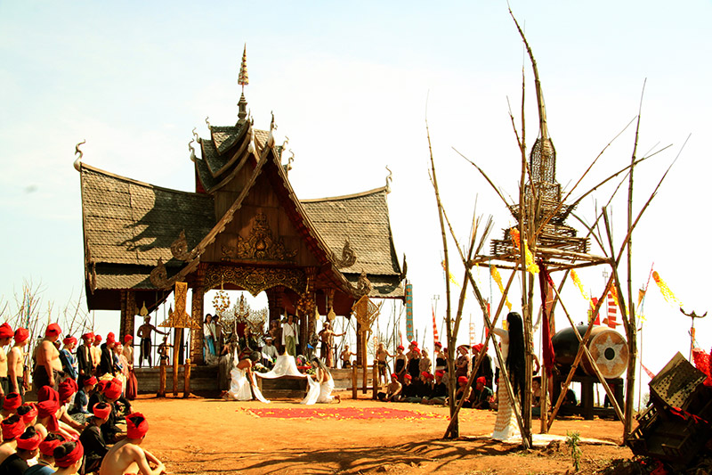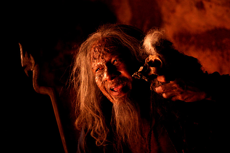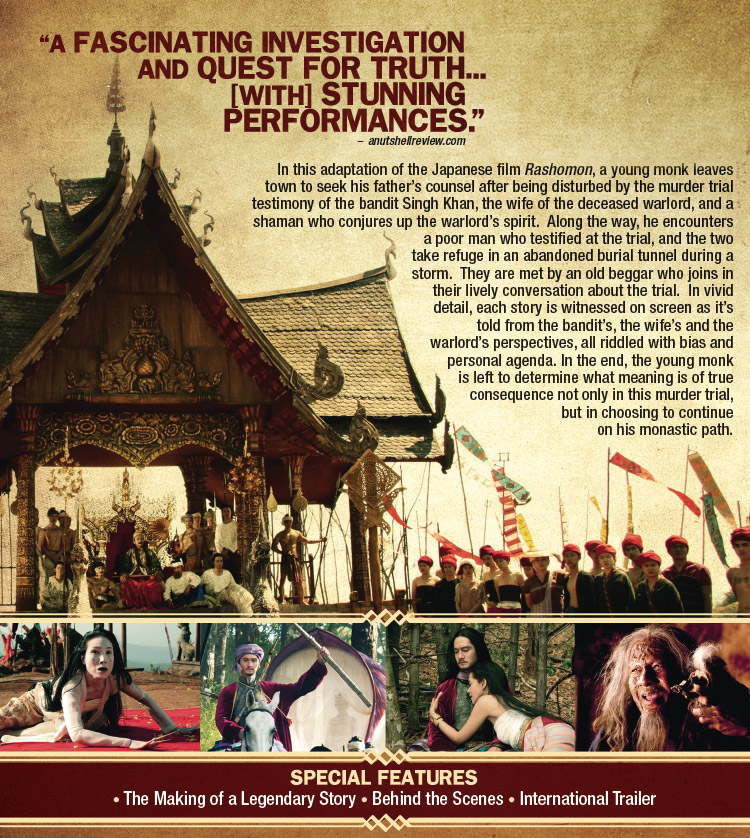 In this adaptation of the Japanese film Rashomon, a young monk leaves town to seek his father’s counsel after being disturbed by the murder trial testimony of the bandit Singh Khan, the wife of the deceased warlord, and a shaman who conjures up the warlord’s spirit. Along the way, he encounters a poor man who testified at the trial, and the two take refuge in an abandoned burial tunnel during a storm. They are met by an old beggar who joins in their lively conversation about the trial. In vivid detail, each story is witnessed on screen as it’s told from the bandit’s, the wife’s and the warlord’s perspectives, all riddled with bias and personal agenda. In the end, the young monk is left to determine what meaning is of true consequence not only in this murder trial, but in choosing to continue on his monastic path.