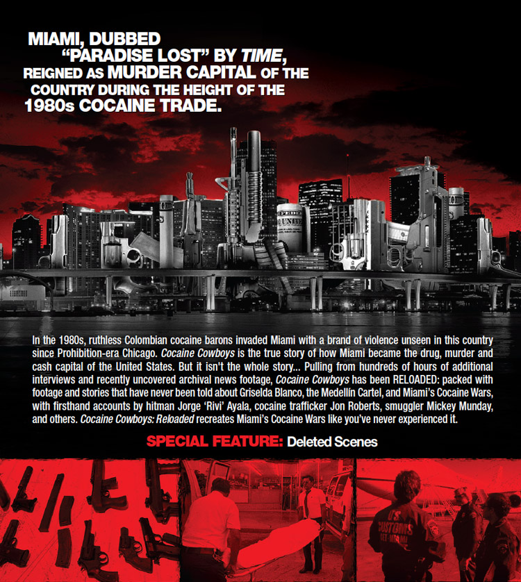 In the 1980s, ruthless Colombian cocaine barons invaded Miami with a brand of violence unseen in this country since Prohibition-era Chicago. Cocaine Cowboys is the true story of how Miami became the drug, murder and cash capital of the United States. But it isn't the whole story... Pulling from hundreds of hours of additional interviews and recently uncovered archival news footage, Cocaine Cowboys has been RELOADED: packed with footage and stories that have never been told about Griselda Blanco, the Medellín Cartel, and Miami’s Cocaine Wars, with firsthand accounts by hitman Jorge ‘Rivi’ Ayala, cocaine trafficker Jon Roberts, smuggler Mickey Munday, and others. Cocaine Cowboys: Reloaded recreates Miami’s Cocaine Wars like you’ve never experienced it. |