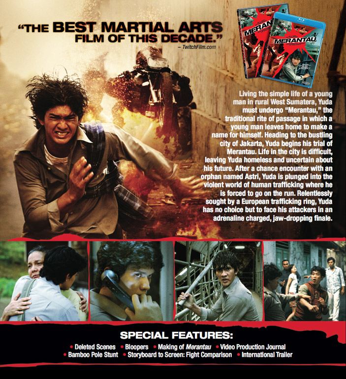 Living the simple life of a young man in rural West Sumatera, Yuda must undergo “Merantau,” the traditional rite of passage in which a young man leaves home to make a name for himself. Heading to the bustling city of Jakarta, Yuda begins his trial of Merantau. Life in the city is difficult, leaving Yuda homeless and uncertain about his future. After a chance encounter with an orphan named Astri, Yuda is plunged into the violent world of human trafficking where he is forced to go on the run. Relentlessly sought by a European trafficking ring, Yuda has no choice but to face his attackers in an adrenaline charged, jaw-dropping finale.
