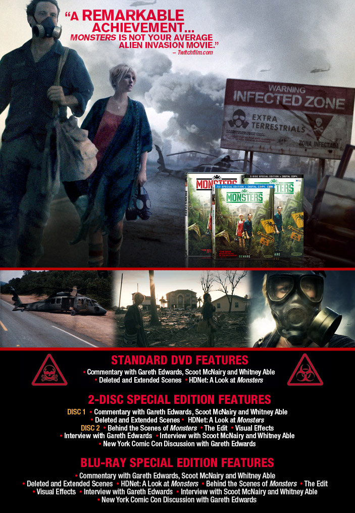 Six years ago NASA discovered the possibility of alien life within our solar system. A probe was launched to collect samples, but crashed upon reentry over Central America. Soon after, new life forms began to appear and half of Mexico was quarantined as an INFECTED ZONE. Today, the American and Mexican military still struggle to contain “the creatures” ... Our story begins when a U.S. journalist agrees to escort a shaken American tourist through the infected zone to the safety of the U.S. border.
