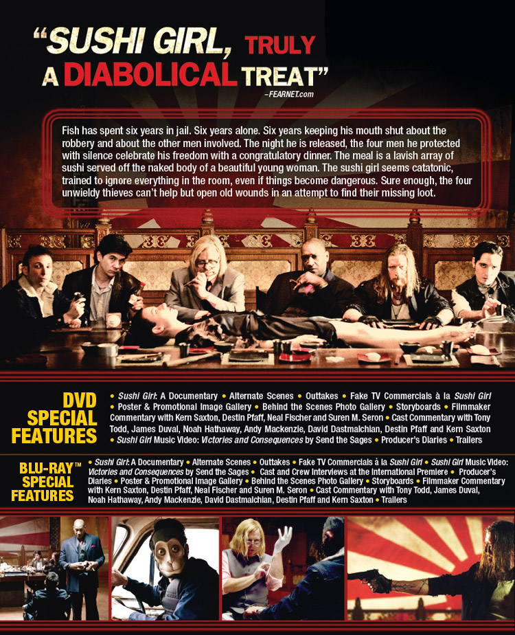 Fish has spent six years in jail. Six years alone. Six years keeping his mouth shut about the robbery and about the other men involved. The night he is released, the four men he protected with silence celebrate his freedom with a congratulatory dinner. The meal is a lavish array of sushi served off the naked body of a beautiful young woman. The sushi girl seems catatonic, trained to ignore everything in the room, even if things become dangerous. Sure enough, the four unwieldy thieves can’t help but open old wounds in an attempt to find their missing loot.