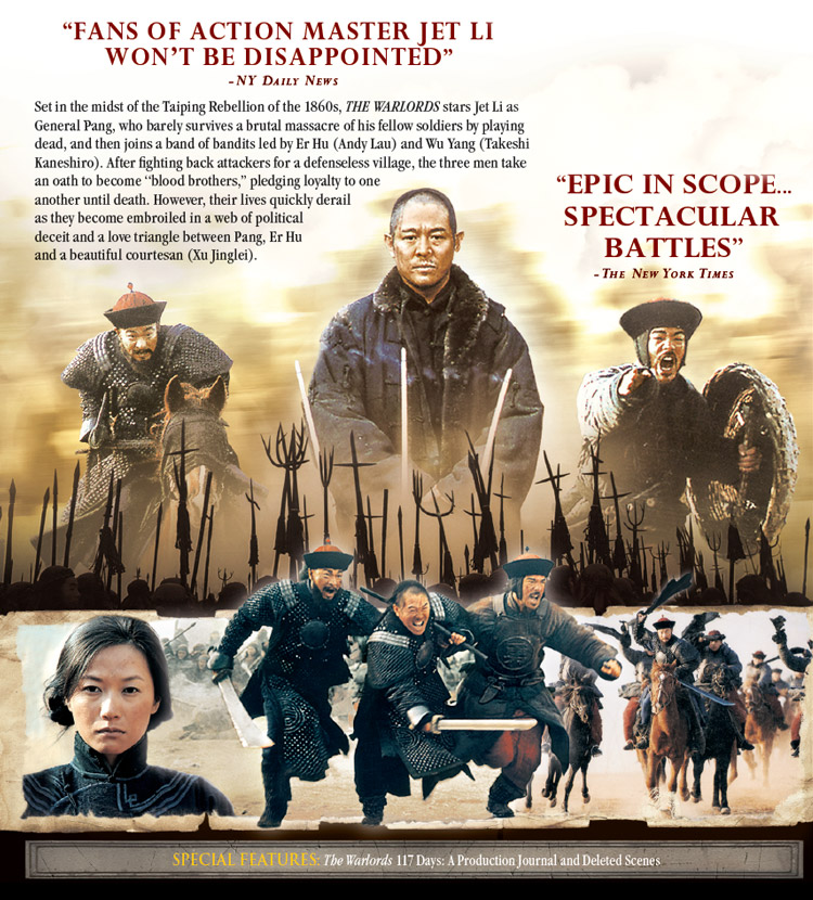 Set in the midst of war and political upheaval during the Taiping Rebellion of the 1860s, WARLORDS stars Jet Li as General Pang, who barely survives a brutal massacre of his fellow soldiers by playing dead, and joins a band of bandits led by Er Hu (Andy Lau) and Wu Yang (Takeshi Kaneshiro). After fighting back attackers from an helpless village, the three men take an oath to become "blood brothers," pledging loyalty to one another until death, but things quickly turn sour and the three men become embroiled in a web of political deceit, and a love triangle between Pang, Er Hu and a beautiful courtesan (Wu Jing-Lei).